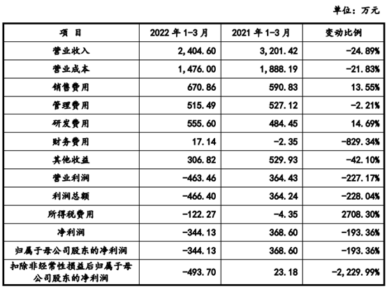 2022年1-3月,磁谷科技开业收入为2,404.6万元,同比消重24.89%;净利润为-344.13万元,上年同期为368.60万元;扣除非时常性损益后归属于母公司股东的净利润为-493.70万元,上年同期为23.18万元;谋划勾当爆发的现金流量净额为128.71万元,上年同期为-566.07万元。