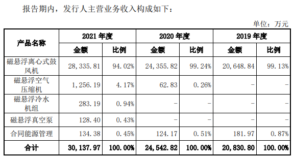 2019年-2021年,公司磁悬浮离心式饱风机发售收入占各期主开业务收入比例均正在90%以上,产物构造较为简单,且正在污水解决规模的操纵占对比高,重要由于正在该规模,饱风机行动重要分娩修设,功率需求大、运转时刻长,行使磁悬浮离心式饱风机的节能效益明显。