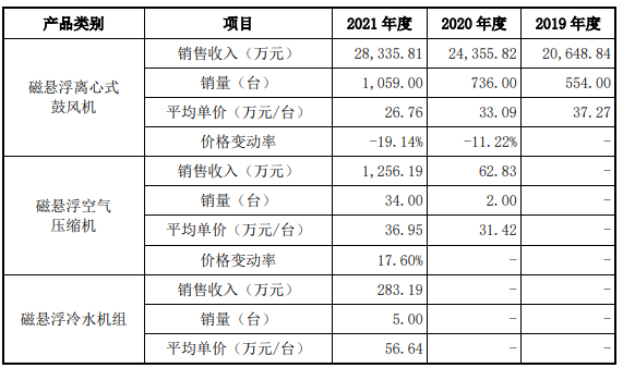 2020年、2021年,磁谷科技磁悬浮离心式饱风机均匀单价分辩同比消重11.22%、19.14%。