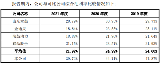 磁谷科技毛利率连降,但与同行比拟,公司毛利率连结3年均为同行最高。2019年-2021年,磁谷科技主开业务毛利率分辩为47.75%、44.21%、39.16%,归纳毛利率分辩为47.87%、44.71%、39.72%,同行均匀值分辩为24.60%、24.99%、21.92%。
