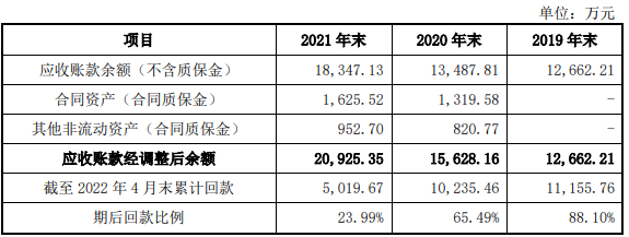 别的,据磁谷科技招股书披露,2019年终、2020年终、2021年终,公司应收账款经调动后余额分辩为12,662.21万元、15,628.16万元、20,925.35万元。