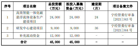 据磁谷科技招股书,“高效智能一体化磁悬浮流体修设分娩开发项目”总投资为24,000.00万元,此中开发投资20,898.16万元,包含土地购买税费1,730.40万元、修筑工程及其他用度13,165.78万元、修设购买及装配工程5,089.23万元和盘算费912.75万元;铺底滚动资金为3,101.84万元。项目筹划开发期为2年,正在项目开发期内重要杀青土地购买、厂房开发、修设购买及装配调试、完好职员装备等,项目修成投产后将造成大功率磁悬浮离心式饱风机300台套、磁悬浮氛围压缩机400台套和磁悬浮制冷压缩机300台套产能。
